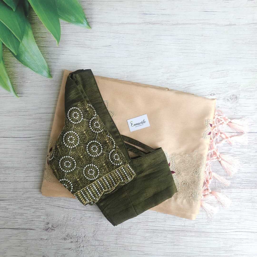 - Linen Silk Antique Zari work saree paired with contrast ready to wear pattern Blouse