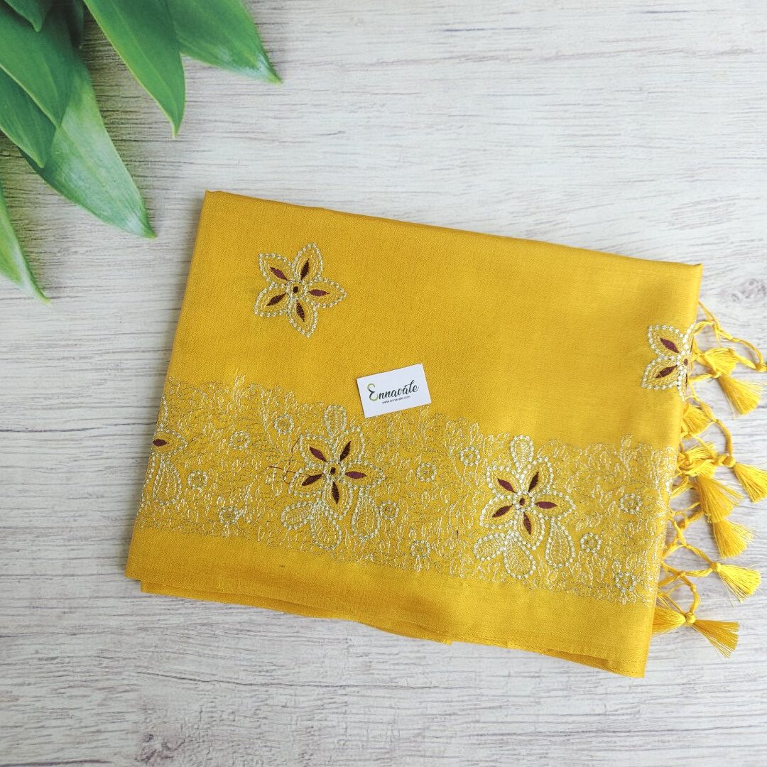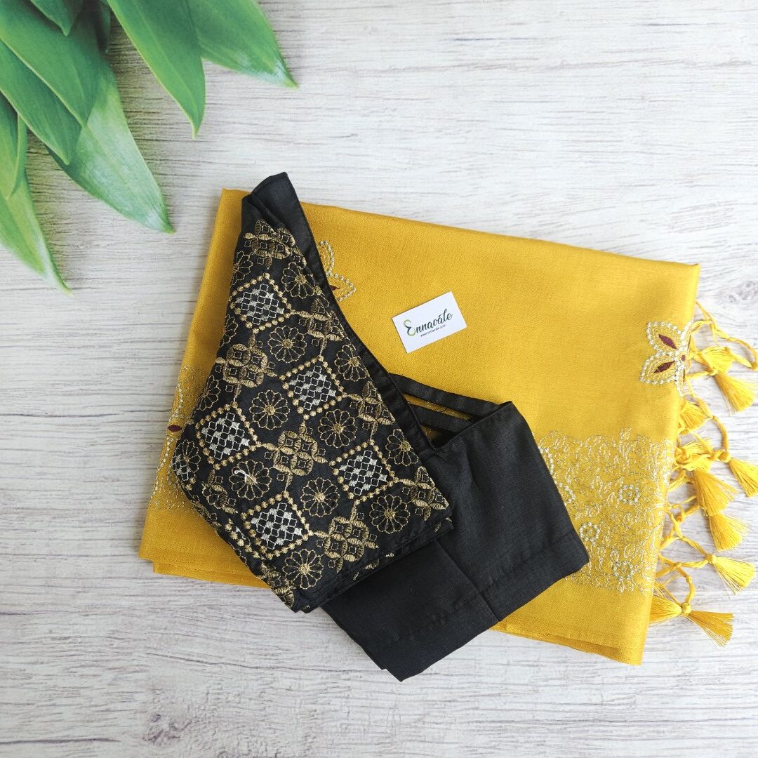 • Linen Silk Antique Zari work saree paired with contrast ready to wear pattern Blouse