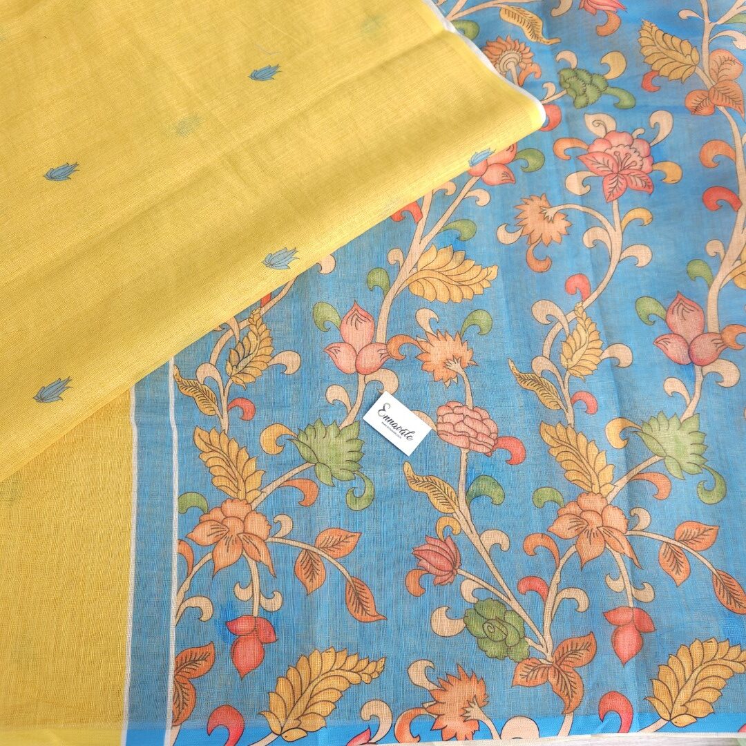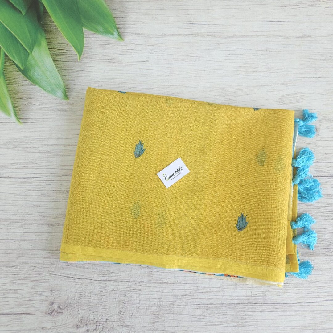 • Linen Cotton Floral Printed Saree and ready to wear pattern Blouse