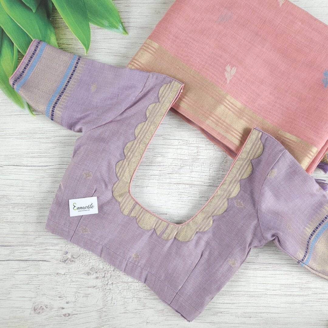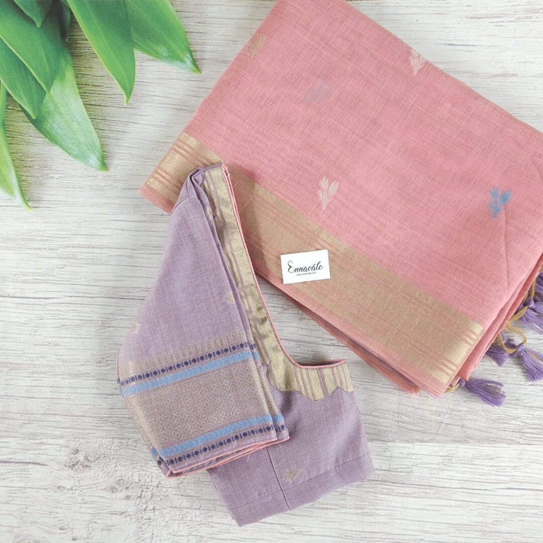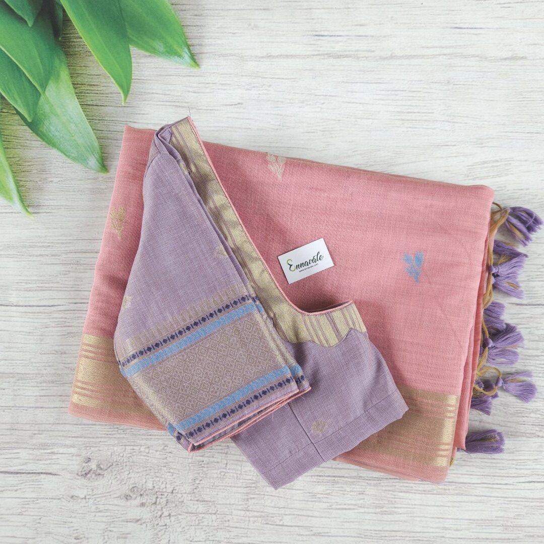 - Beautiful Muga Cotton Saree with Thread Work and Contrast ready to wear pattern Blouse