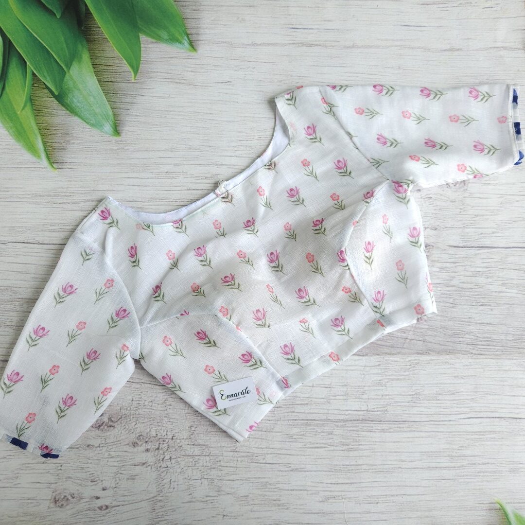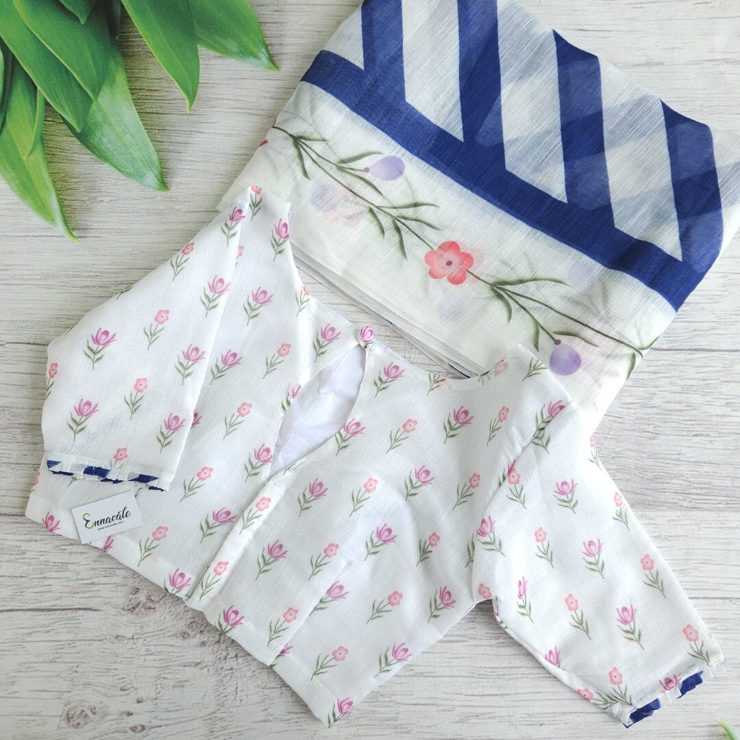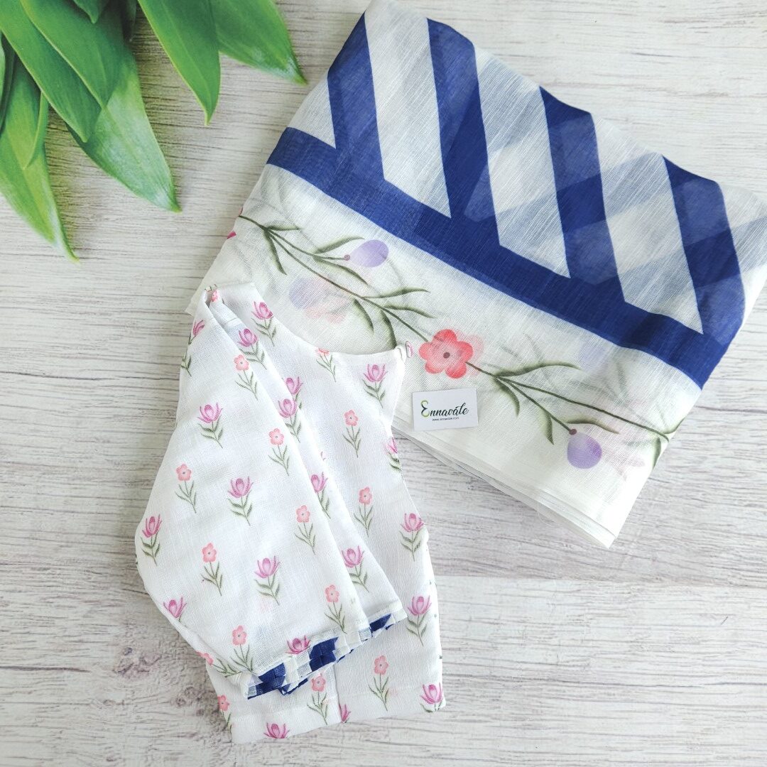 - Linen Cotton Floral Printed Saree and ready to wear pattern Blouse