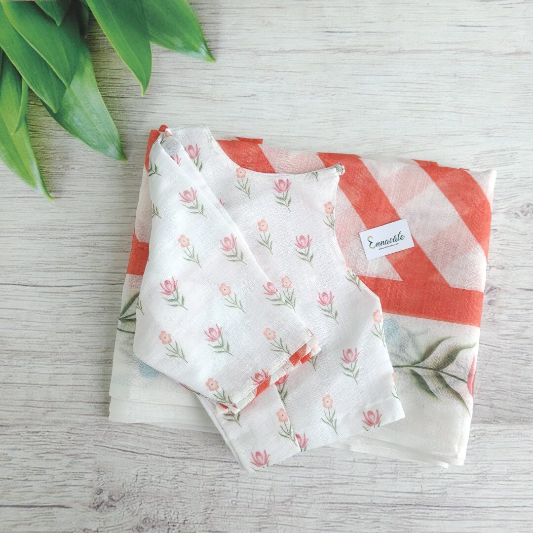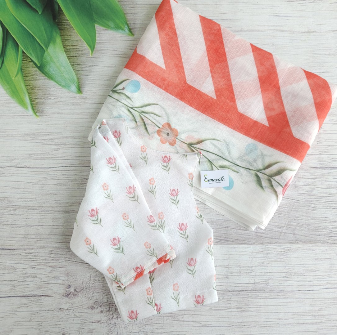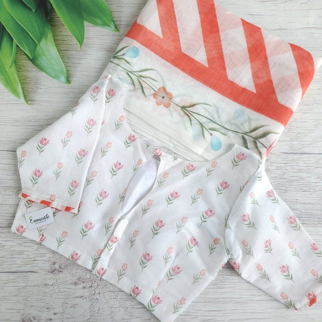 Linen Cotton Floral Printed Saree and ready to wear pattern Blouse