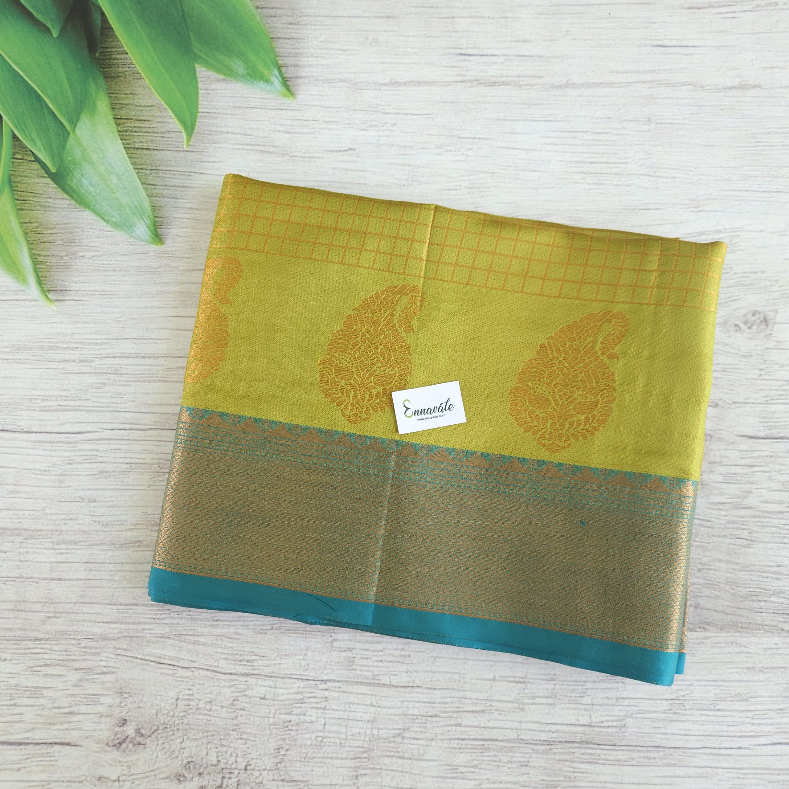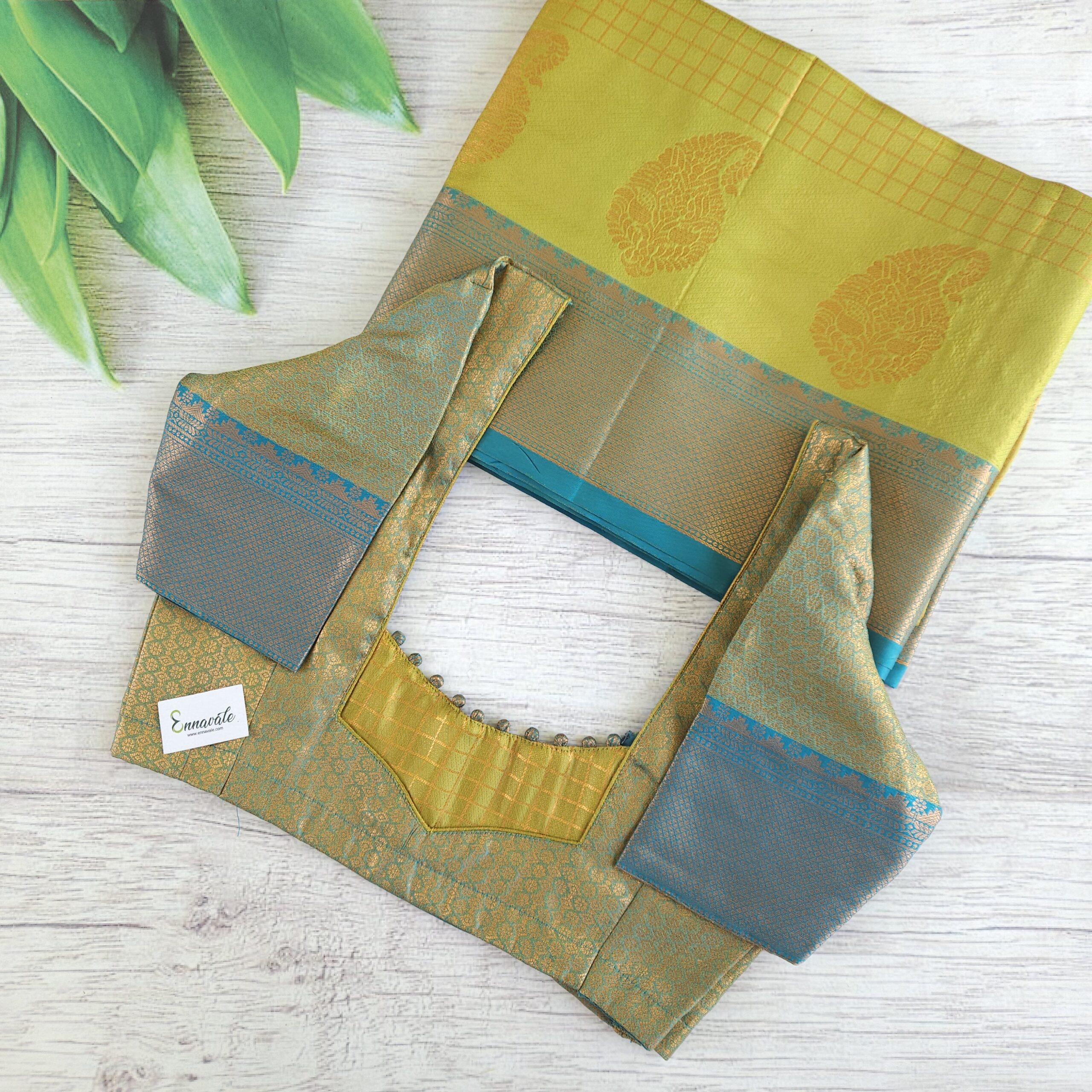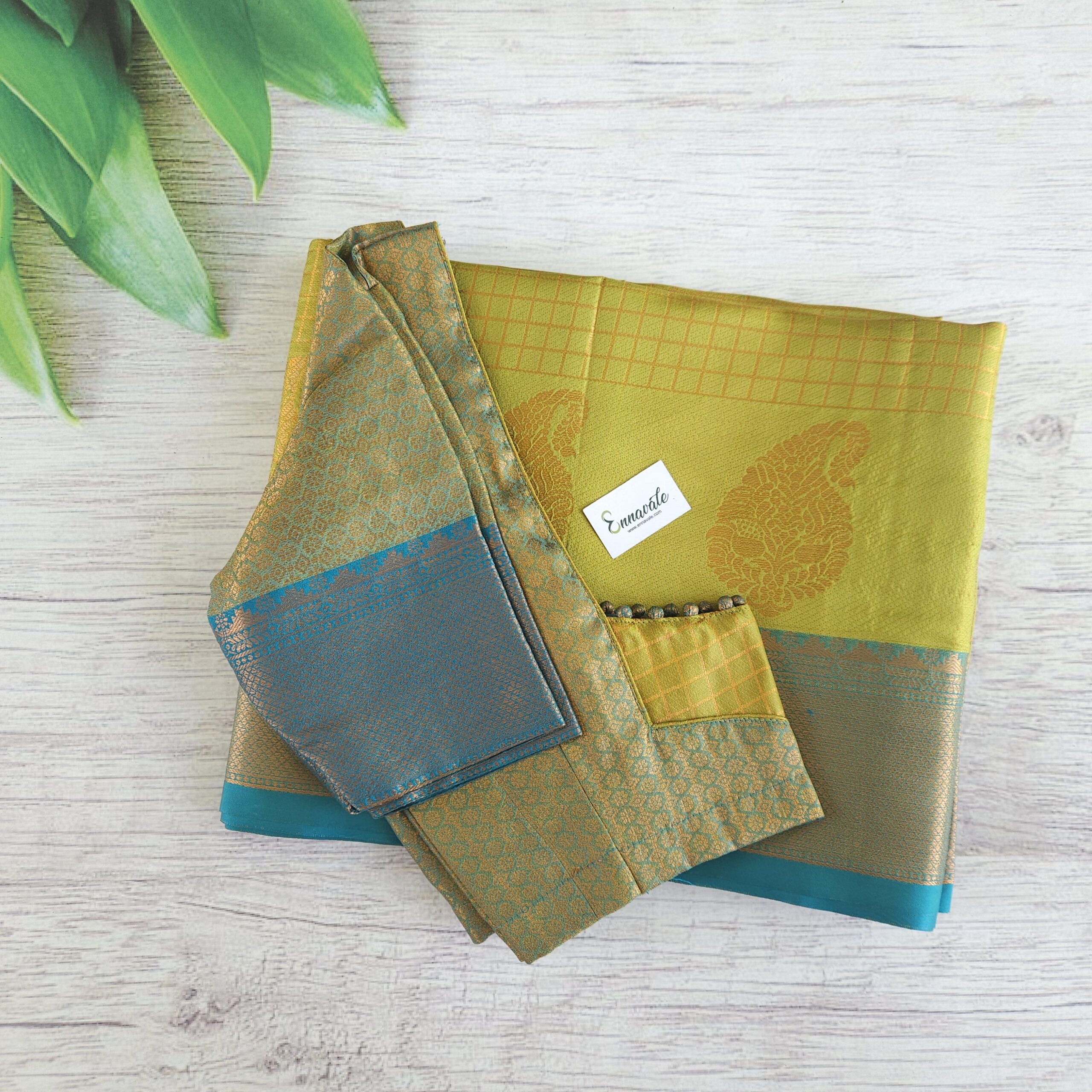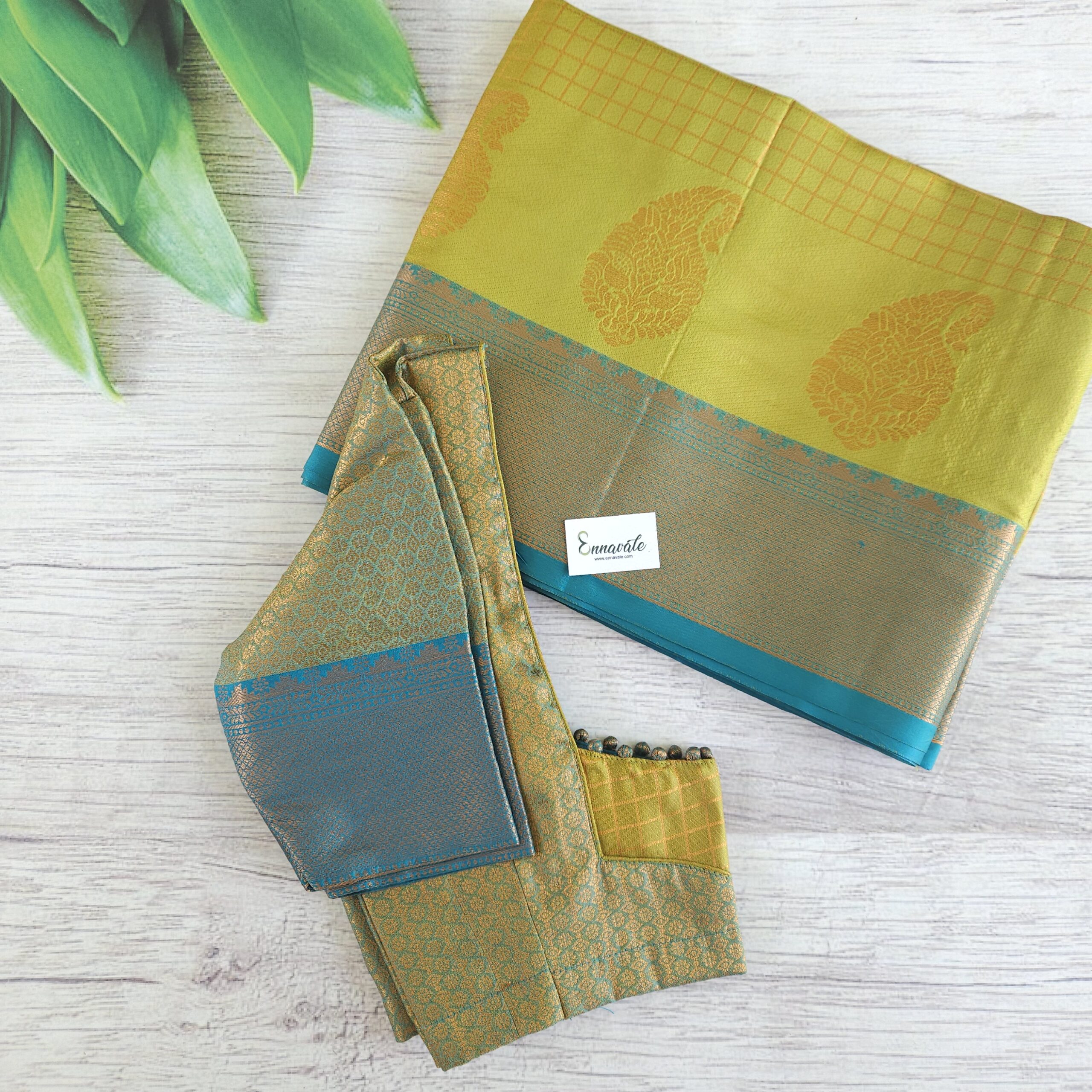 - Kanchi Semi Silk saree with Zari work and ready to wear contrast pattern Blouse