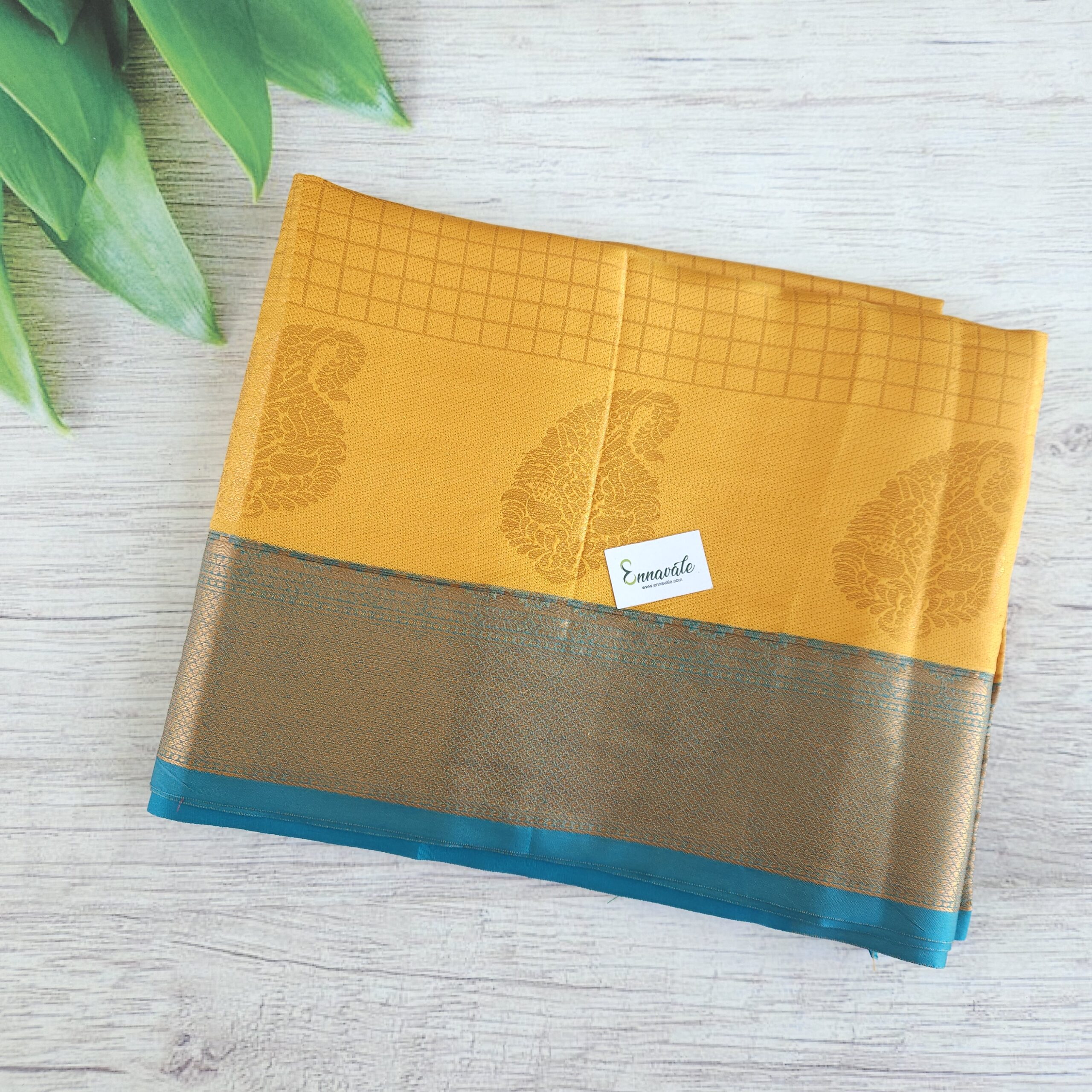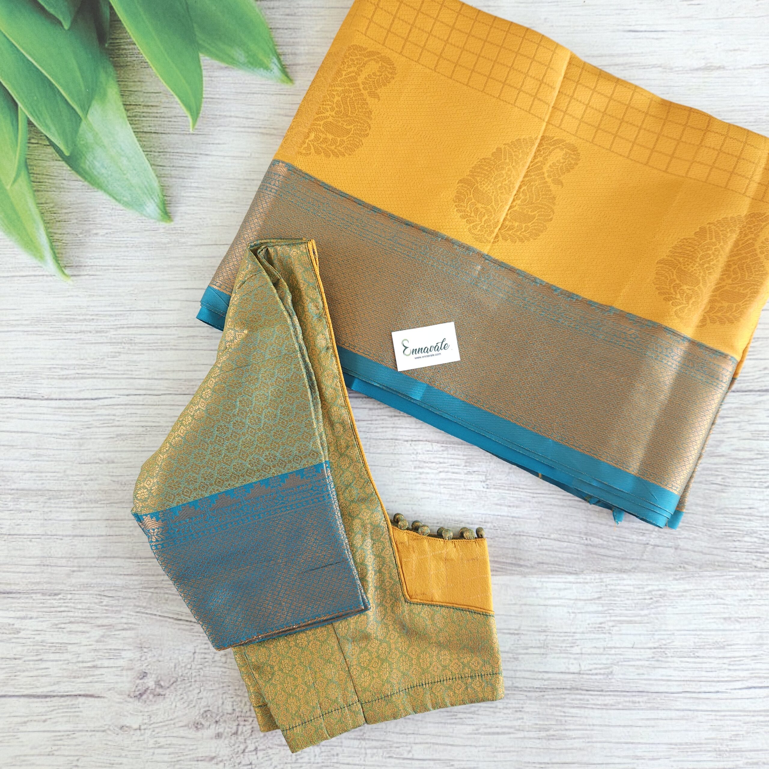 - Kanchi Semi Silk saree with Zari work and ready to wear contrast pattern Blouse