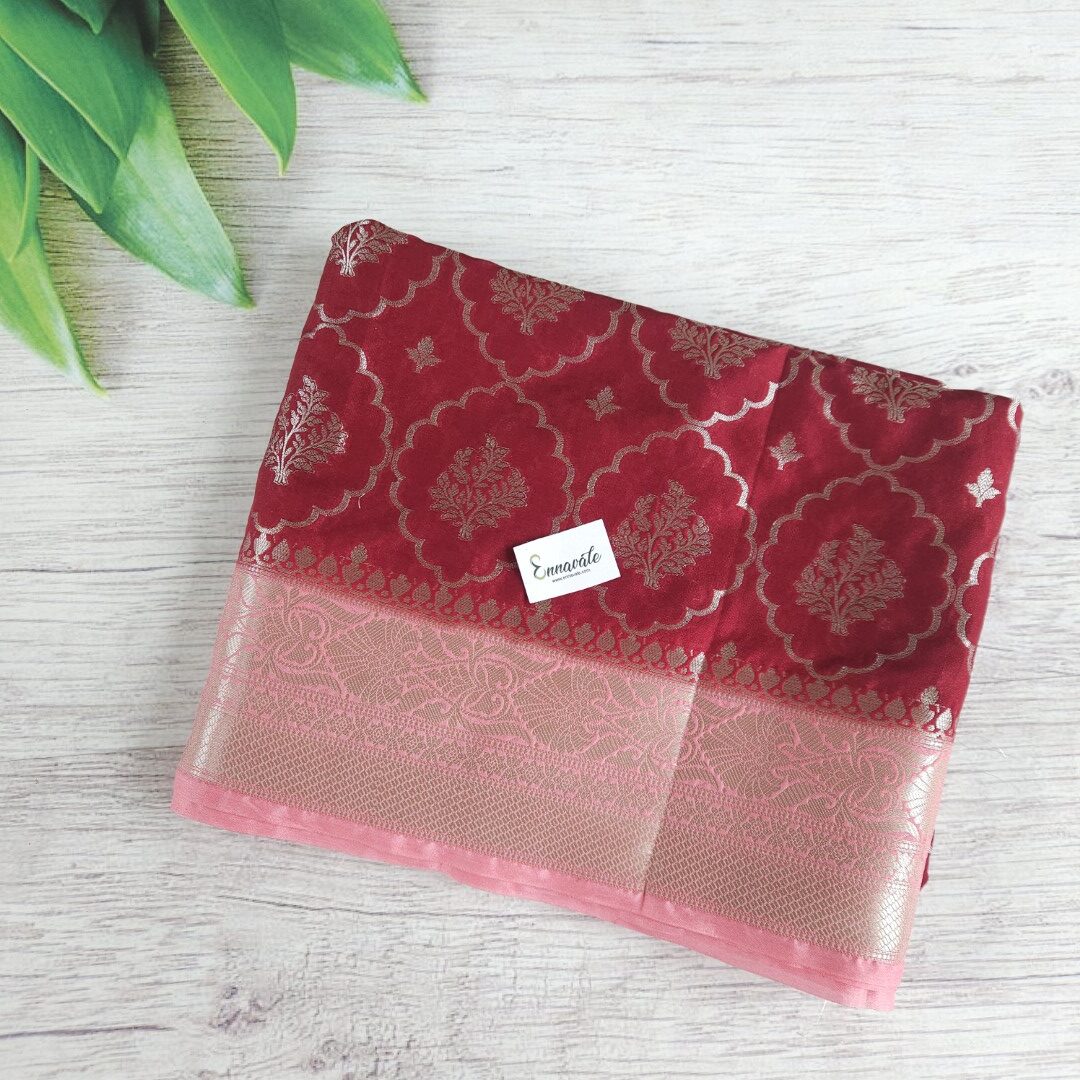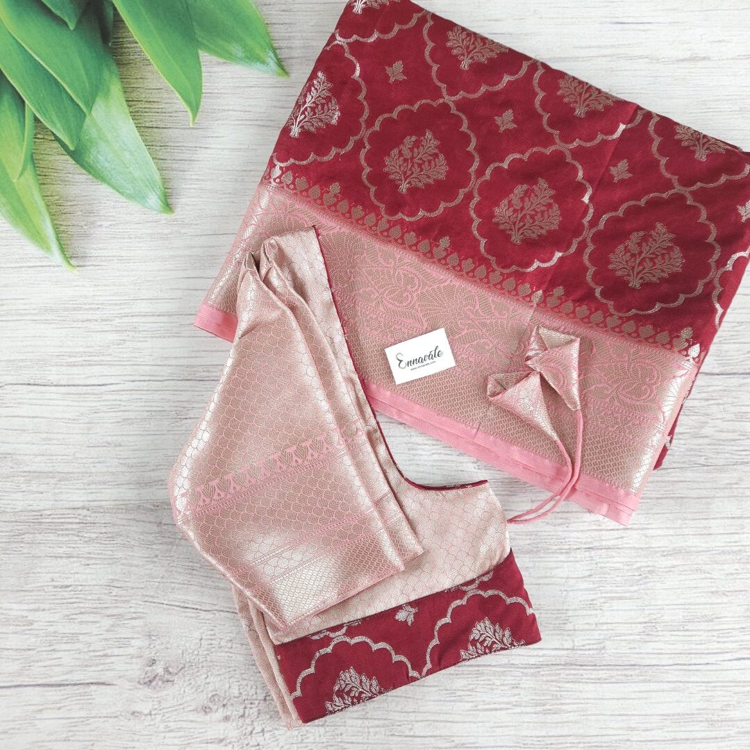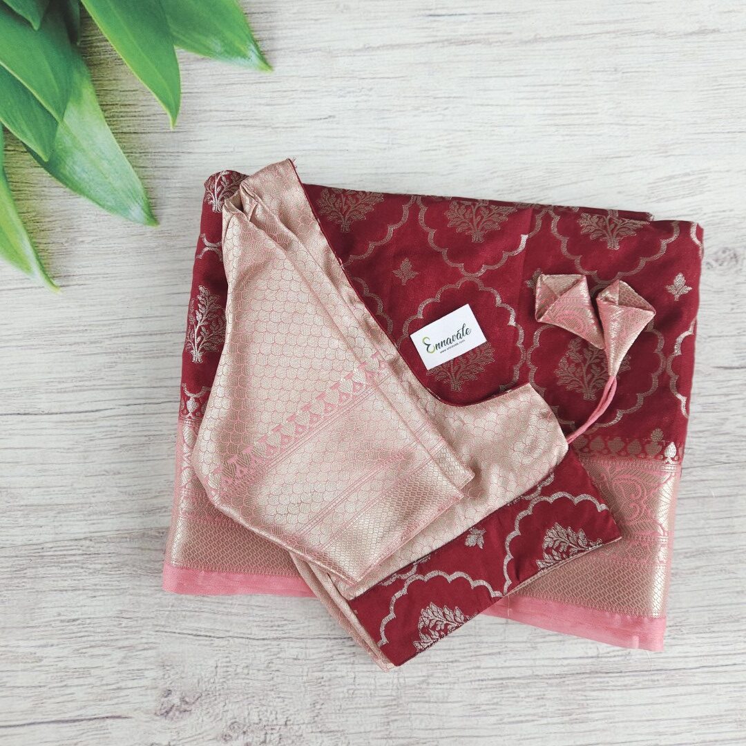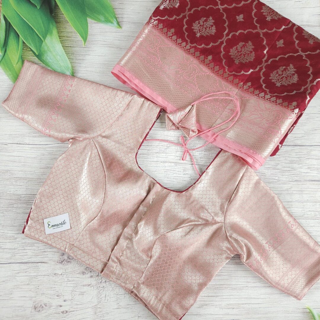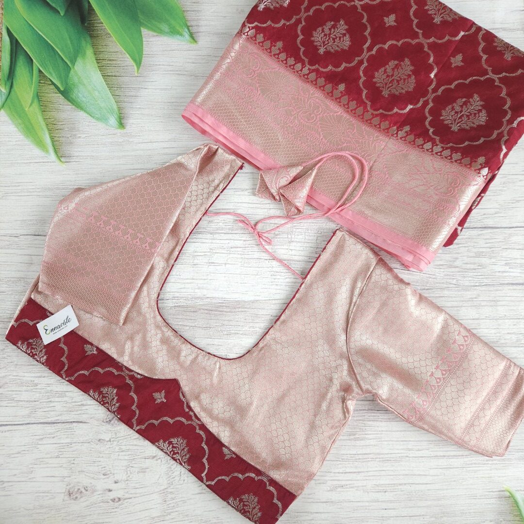 Banarasi Semi Silk saree with Zari work and ready to wear contrast pattern Blouse