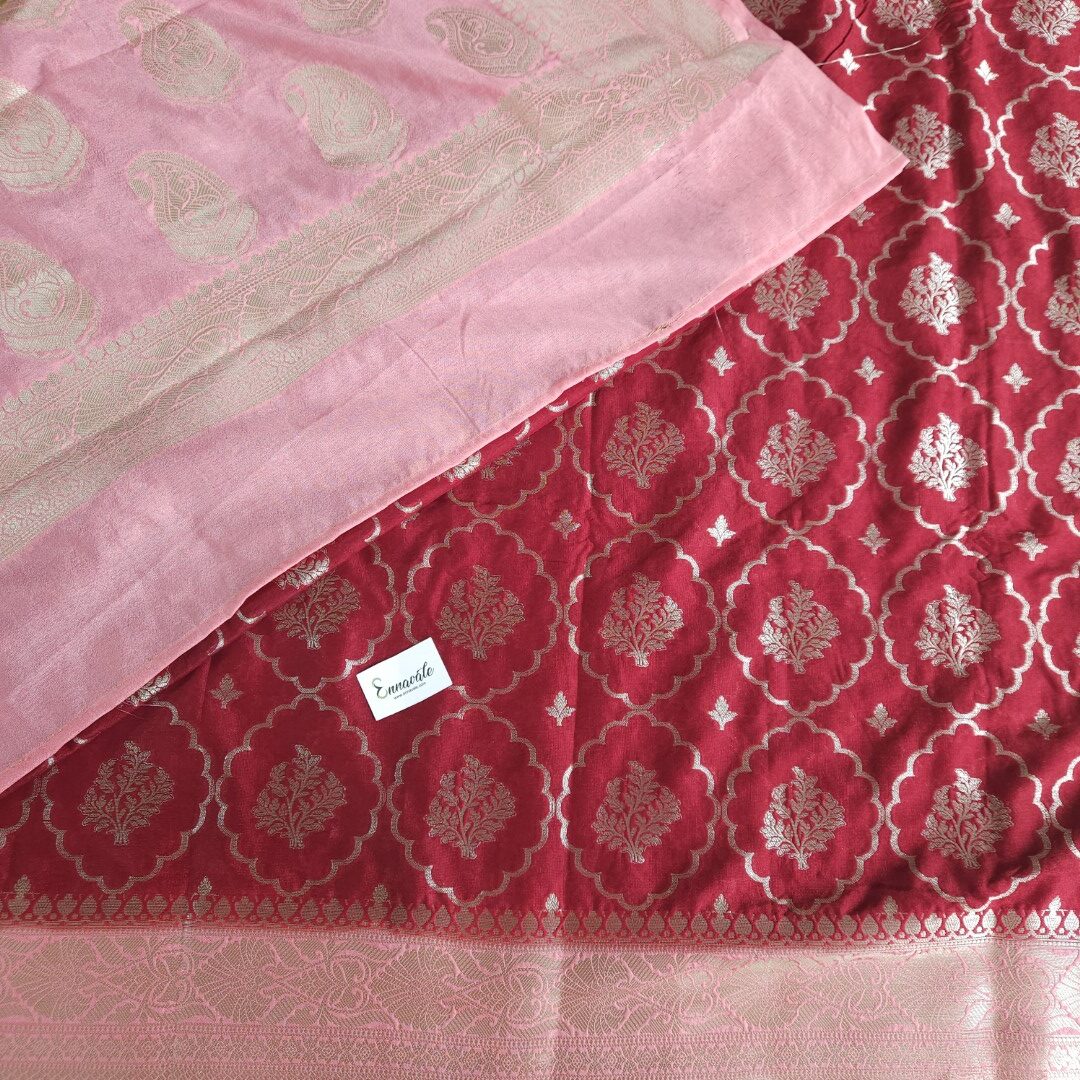 • Banarasi Semi Silk saree with Zari work and ready to wear contrast pattern Blouse
