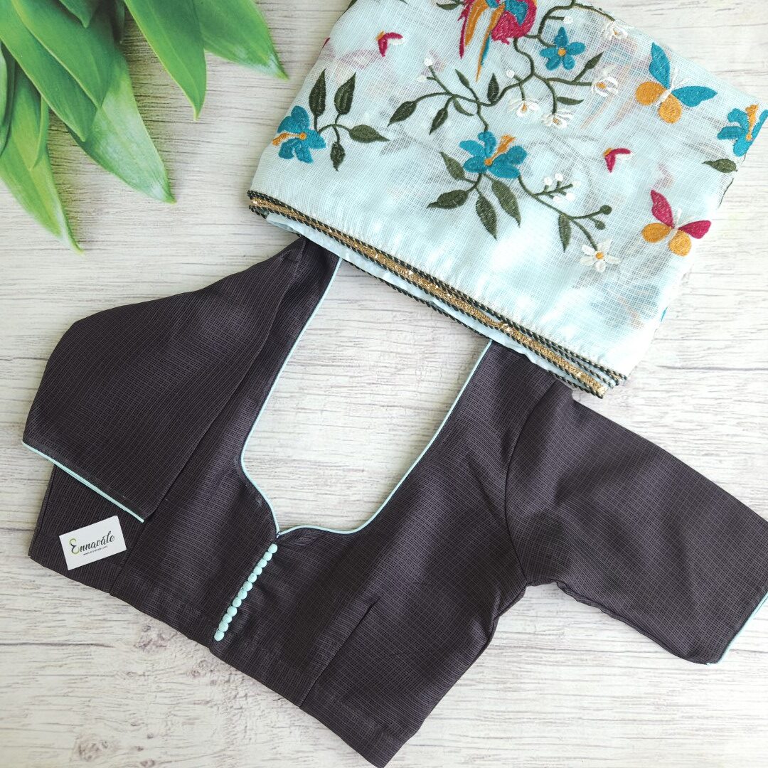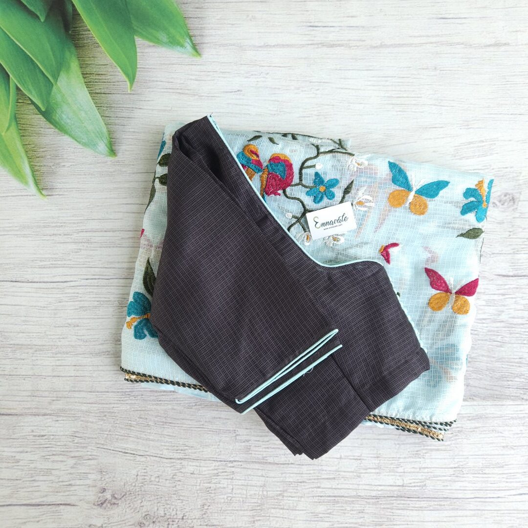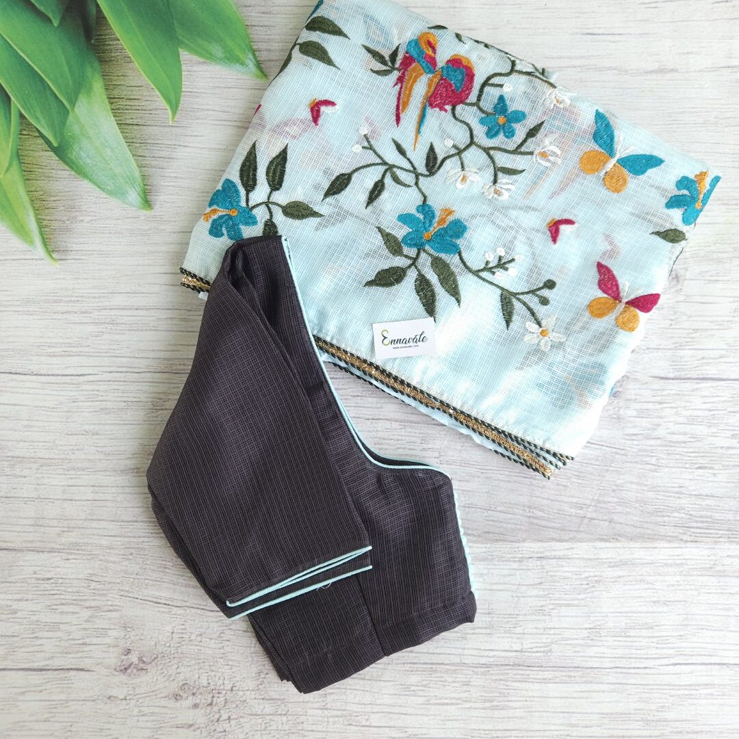 - Kota Cotton Embroidery Saree and Contrast ready to Wear pattern Blouse